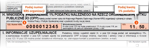 O tym na którą Organizację Pożytku Publicznego przekazujemy 1,5% podatku, informujemy Urząd Skarbowy poprzez podanie w głównym formularzu deklaracji podatkowej (PIT-37, PIT-36, PIT-36L, PIT-28, PIT-38) dwóch ważnych informacji:- Numer KRS wybranej organizacji pożytku publicznego